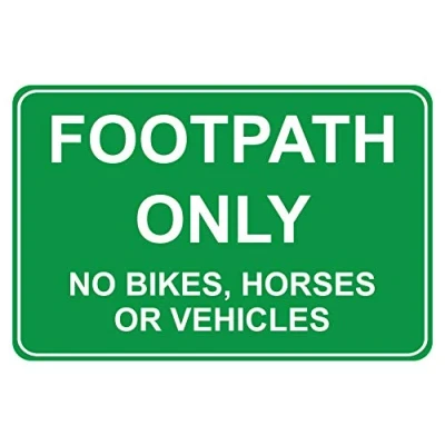Footpath only no bikes, horses or vehicles safety sign 3mm Aluminium sign 300mm x 200mm Digitally printed and laminated for extra durability 10mm Radius rounded corners, no sharp edges, Manufacturer: KPCM Display ltd