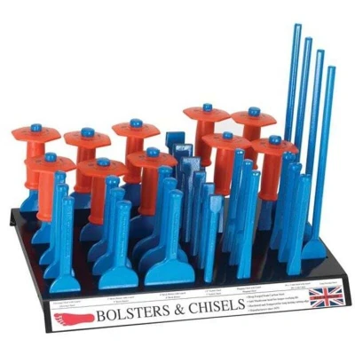 General description The Footprint Tools 35 Bolsters and Chisels Stand is an essential addition for any hand tool retailer, providing a comprehensive selection of chisels and bolsters for various applications. Technical specifications Includes: 3 x Brick Bolsters 75mm (3in) 2 x Brick Bolsters with Guards 75mm (3in) 3 x Brick Bolsters 100mm (4in) 2 x Brick Bolsters with Guards 100mm (4in) 3 x Plugging Chisels 2 x Plugging Chisels with Guards 3 x Flooring Chisels 2 x Flooring Chisels with Guards 4 x Long Flooring Chisels 3 x Scutch Chisels 25mm (1in) 3 x Scutch Chisels 38mm (1.1/2in) 3 x Cold Chisels 250 x 25mm (10 x 1in) 2 x Cold Chisels with Guards 250 x 25mm (10 x 1in)
