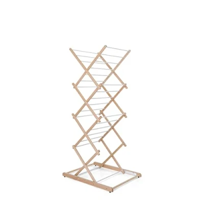 Freestanding or overbath folding clothes airer Adjustable to two heights 10 linear metres of drying space Folds completely with pantograph system to just 12 cm for storage Structure in solid wood and coated aluminium rails