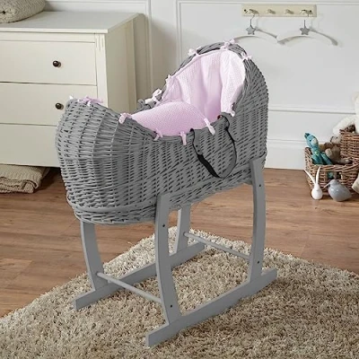 DIMENSIONS: Wicker basket measures 83 cm long x 49 cm wide, with mattress size of 66 cm x 29 cm, perfect for newborns and young infants ROCKING FEATURE: Includes sturdy rocking stand that provides gentle, soothing motion to help calm and lull baby to sleep COMFORT FEATURES: Hand-woven wicker construction with Space-Tec padding and hypoallergenic mattress for optimal comfort and support PRACTICAL DESIGN: Machine-washable polyester-cotton blend fabric offers year-round temperature regulation and easy maintenance VERSATILE USE: Compatible with similar bedding products, whilst classic wicker design adds timeless charm to any nursery décor