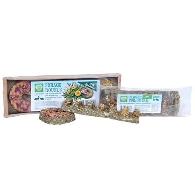 COMPLETE DUO: One pack of Forage Rounds and one Flower Forage Bar bundled together for variety in your small pet's treats. NATURAL INGREDIENTS: Crafted with meadow grass, timothy hay, and botanical ingredients including rose petals, herbs, and chamomile for a wholesome treat. ENRICHMENT FOCUSED: Specially designed to encourage natural foraging behaviour whilst providing mental stimulation for your small pets. VERSATILE SERVING: Feed whole or break into smaller pieces to create an engaging feeding experience for rabbits, guinea pigs, and other small pets. PREMIUM QUALITY: Formulated with 100% pet-safe ingredients, containing no artificial additives, sugars, or unnecessary fillers.