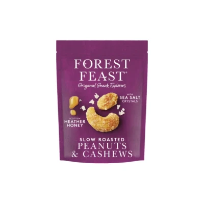 Forest Feast has selected colossal cashews and jumbo peanuts, glazed them with the unique golden nectar of Scottish heather honey, then roasted them with hand-harvested sea salt. An all-round favourite!- Vegetarian- Gluten-free- With heather honey Ingredients: peanuts (40%), cashew nuts (40%), sugar, sunflower oil, glucose syrup, honey, sea salt, heather honey (1%). Allergy advice: Forest Feast's roastery also handles other nuts and sesame seeds.Storage conditions: store in a cool, dry place. Once opened, use within one week.