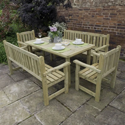 ShedstoreDine in style outdoors with the Forest Rosedene Wooden Garden Table, Benches and Chairs Set 8â9 x 6â2. Classic and Comfortable Design This classic patio set is a great way to entertain family and friends while enjoying your garden. The sturdy wooden table comes with a 90cm x 160cm top, which provides plenty of space for diners. The two 5ft benches and two chairs have been designed with comfort in mind and feature smooth-planed timber for a splinter-free finish, along with high arm rests. A Superior Build The set is constructed from smooth-planed, pressure-treated timber, resulting in a superior build thatâs designed to last. The timber is also PEFC® certified, which means itâs sourced from sustainably managed forests. Best of all, the patio set comes with an excellent 15-year anti-rot guarantee, so you can have long-term confidence in your purchase. Delivery and Assembly We offer free shipping to the majority of UK postcodes. The set is delivered in flat-pack format and comes with comprehensive instructions for a smooth assembly process. Forest Rosedene Patio Dining Range The Forest Rosedene range includes standalone chairs, benches and tables, as well as garden furniture sets, allowing you to mix and match as desired. Key Features Traditional, sturdy patio furniture thatâs built to last Perfect for outdoor dining Seats up to eight 15-year anti-rot guarantee Manufactured from pressure-treated, PEFC®-certified timber Delivered flat-pack for easy self-assembly Set includes 2 x Forest Rosedene Wooden Garden Benches, 2 x Forest Rosedene Wooden Garden Chairs and 1 x Forest Rosedene Wooden Garden Table