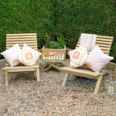 The Forest Slatted Wooden Garden Table and Chairs Set 2â3 x 3â11 will bring a chic and contemporary touch to your garden. A Sleek and Contemporary Outdoor Table and Chairs Set The set includes two chairs and a table, which share a modern, slatted design and elegant construction. Combined they create a stylish, compact and comfortable seating area that will look at home in any corner of your patio or garden. While this slatted bistro table and chairs set is eye-catching, itâs also practical and built to last. The pressure-treated wood helps to boost the durability and longevity of the set, even in the face of the changeable British weather. Smooth-planing ensures that the wood is splinter-free, maximising comfort, and the PEFC-certified mark guarantees the timber has been sourced from sustainably managed forests. Best of all, the garden table and chairs come with an amazing 15-year guarantee against rot and decay, so you can add the set to your garden with confidence. Forest Slatted Garden Furniture Range The Forest Slatted Wooden Garden Chair and Forest Slatted Wooden Garden Table are also available to purchase as individual products, so you can create a bespoke garden seating area with ease. Shipping and Assembly As with all of our Forest products, we offer free shipping to the majority of UK postcodes. The set will arrive in flat-pack format and require minimal assembly, so youâll be able to construct it quickly and store it away easily in your garage or shed during the colder months. Key Features Modern, slatted design Splinter-free finish for maximum comfort 15-year anti-rot guarantee Made from pressure-treated and PEFC®-certified wood Comes in flat-pack format and with no fixings for a smooth assembly process Easy to store away when not in use Set includes: two Forest Slatted Wooden Garden Chairs and one Forest Slatted Wooden Garden Table
