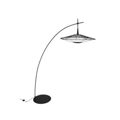Sweeping designer floor lamp Carpa with movable lampshade Designed like an arc lamp, the large-framed floor lamp Carpa impresses above all with its unusual design. Designer Jette Scheib appreciates geometric forms and uses traditional materials to create such wire constructions. She is convinced that no piece of furniture, no matter how beautiful, will ever fully unfold without the right lighting and so she designs functional products with the power to create a sense of well-being. She has succeeded in doing this with Carpa - the flat, large, downward-opening lampshade is a weave of wire and cotton. The unmistakable Form provides atmospheric light, the effect of which is influenced by deliberate details. Below the bulb to be used, fine struts hold a bowl that has an integrated hole in the centre and is curved downwards. As a result, the light is directed towards the floor surface, but is also reflected by the metallic surface and reflected upwards, where it emerges through the fine mesh of the cotton weave and draws enchanting patterns in the room. The stable, round base holds the protruding, graceful arm and provides the necessary stability. The black appearance blends uncompromisingly into numerous furnishing styles and enriches living areas with a decorative and practical lighting object that can also be placed behind a large couch. Die is operated effortlessly via a foot switch.