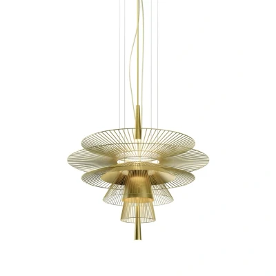 Gravity 1 Suspension Golden is an inventive metal construction that appears to float weightlessly. The lampshade’s combination of metal rods and circles contributes to the harmonious interaction between the shapes, which float together, creating a beautiful visual effect when the lamp is on.