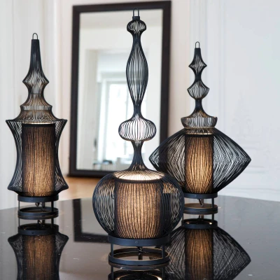 Black Impératrice table lamp - a work of art made of numerous metal wires Numerous curved lines and various round Forms form the impressive and unmistakable lampshade of the Impératrice table lamp, which is made entirely of metal. A multitude of fine metal struts form the lampshade and provide a view of the Innes, where a second, cylindrical shade sits in which the bulb is placed. The nature of the lampshade on the inside emits a diffuse, glare-free light, which is emitted outwards through the struts in an atmospheric pattern and bathes the room in a special atmosphere. Impératrice looks like a decorative object that conjures up cosy accent lighting as a highlight and adds that certain something to the interior. The light was designed by the French designer light manufacturer Forestier. Das can look back on numerous creations by its designers, which were designed according to the motto "Be bold and set a new trend". They play with wire and transparency and with the idea of respecting Nature in all its forms. The highest priority is given to craftsmanship and recognising the people who use it. The combination of the values of passion, freedom and discovery give rise to objects with a strong identity.