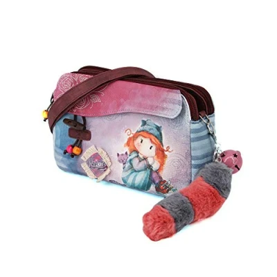 Shoulder bag with three compartments and front pocket Main compartment with magnetic closure and two external ones closed with zipper Inner lining with closed pocket and additional compartments Adjustable shoulder strap 120cm long Dimensions: 15.5 x 24 x 10 cm