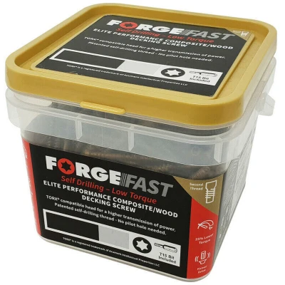 General description The ForgeFast Decking Screws Countersunk TORX Compatible T25 are designed for fixing into both softwood and hardwood. They feature a deep TORX compatible insert that minimizes cam-out, allowing for higher torque levels and a more secure drive. The screws have a super sharp tip for immediate bite from the first turn, and recessed under-head ribs ensure excellent countersinking. A patented self-drilling thread eliminates the need for pre-drilling, reducing the risk of timber splitting, even when screwing close to the edge. These screws are protected by elementech 2000 surface treatment, providing corrosion resistance significantly longer than standard zinc-coated screws. They are also highly resistant to pull-out and can flex up to 35mm, minimizing the likelihood of screw shearing in flexible materials. Technical specifications Size: 5.0 x 100mm Pack Size: Tub of 300 Finish: Tan elementech 2000 MPN: FFDS5100TT EAN: 5028485180555 Other information CE approved for use