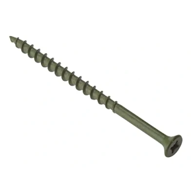 These screws have been specially designed with a hardened and green treated finish, providing excellent corrosion resistance, particularly in conjunction with ACQ (Alkaline Copper Quaternary) treated timber. This makes them exceptionally durable for long-term use in construction and decking applications. The green treatment not only enhances resistance against rust but also integrates seamlessly with environmentally friendly timber treatments.