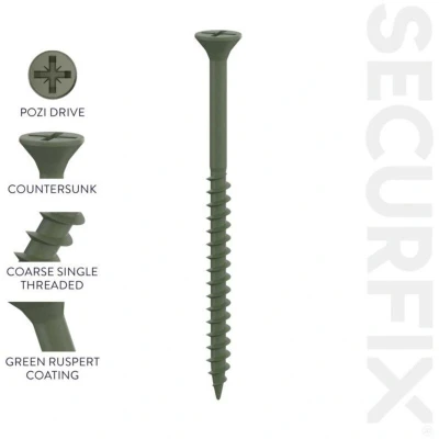 General description These Forgefix single threaded Decking Screws feature Pozi compatible heads and are specially designed, hardened, and green treated. They are specifically used in decking applications but are also widely applicable in exterior timber and fencing projects. The screws are designed to prevent splitting of the boards while allowing them to expand and contract with changing seasons. Technical specifications Type: Decking Screw Head: Pozi compatible Size: 4.5 x 75 mm Quantity: Tub of 1000 Finish: Green treated for corrosion resistance Corrosion resistance: 1,000 hour green treated finish Usage Ideal for decking applications Suitable for exterior timber and fencing