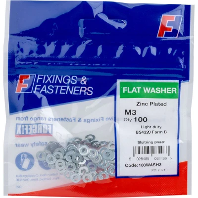 General description These Forgefix Form B Flat Washers are designed to provide a smooth surface for nuts or bolts, ensuring a secure fastening by distributing the load evenly. Zinc plated for enhanced corrosion resistance, these washers are suitable for various bolting applications and compatible with all types of bolts and nuts. Technical specifications Finish: Zinc Plated Pack Quantity: 100 washers per bag Size: M3 Compatibility and accessories Compatible with all types of bolts and nuts Installation Place the washer under the bolt head or nut face before tightening Ensure the washer is properly seated to distribute the load evenly Usage Use in all bolting applications where load distribution and corrosion resistance are needed Suitable for both indoor and outdoor projects due to zinc coating protection