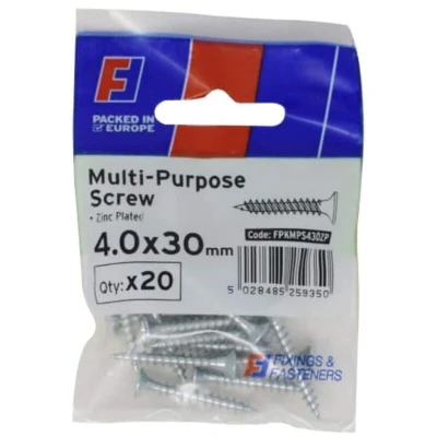 General description The Forgefix Multi-Purpose Pozi Screw CSK ST ZP 4.0 x 30mm is a pack of 20 versatile screws designed for various applications in trades such as joinery, electrical, and plumbing, as well as for DIY projects. These screws feature a countersunk head and a durable zinc finish that enhances their longevity and resistance to oxidation. Technical specifications Type: Pozi screw Head: Countersunk Finish: Zinc Size: 4.0 x 30mm Pack size: 20 screws Compatibility and accessories Suitable for use with materials including PVCu, timber, chipboard, MDF, and similar types. Usage Ideal for various trades and DIY applications. Designed to sink flush with substrates for a smooth surface finish. Single threads provide higher pull-out values and quicker insertion.
