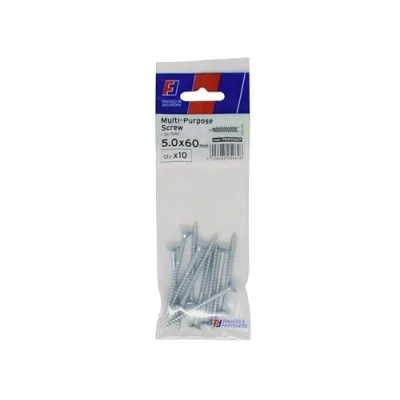 General description ForgeFix Multi-Purpose Pozi Screws CSK ST ZP 5.0 x 60mm are versatile screws with countersunk heads, designed for durability with a zinc finish. They are suitable for various trades including joinery, electrical, plumbing, and are also popular for DIY applications. Technical specifications Type: Pozi screw Head: Countersunk Finish: Zinc Dimensions: 5.0 x 60mm Pack size: 10 screws Compatibility and accessories Compatible with materials such as PVCu, Timber, Chipboard, MDF, and similar types. Usage Ideal for various applications in joinery, electrical, plumbing, and DIY projects. Other information The Pozidriv screw features four additional points of contact compared to the Phillips screw, preventing cam-out and allowing for greater torque application. The countersunk head design ensures a smooth surface finish when sunk flush with substrates. Single threads provide higher pull-out values and quicker insertion.