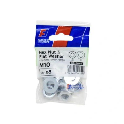 General description This pack contains 8 ForgeFix Nut & Washers suitable for various fastening applications. They are designed to provide a secure and reliable connection in different DIY and home improvement projects. The nuts and washers are bright zinc plated to enhance corrosion resistance, ensuring durability over time. Technical specifications Material: Metal with bright zinc plating Quantity: 8 pieces (Nut & Washers) Size: M10 Compatibility and accessories Compatible with M10 bolts and screws Suitable for use with other fastening components in DIY and home improvement projects Installation Use with compatible M10 bolts or screws Ensure washers are placed correctly to distribute load and prevent damage Usage Ideal for securing fixtures, fittings, and structural components Suitable for indoor and outdoor applications due to corrosion-resistant coating