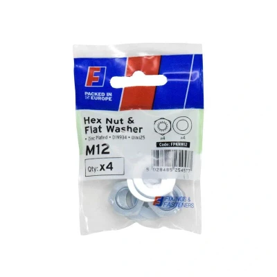 General description Pack of 4 ForgeFix Nut & Washers M12 for fastening applications. Suitable for various DIY and home improvement projects. Technical specifications Size: M12 Material: Metal with bright zinc plating Quantity: 4 pieces per pack Compatibility and accessories Compatible with M12 bolts and screws Can be used with other fastening components requiring M12 nuts and washers Installation Use with appropriate tools to tighten onto M12 bolts or screws Ensure proper fit to secure components effectively Usage Ideal for securing fixtures Furniture assembly General fastening tasks