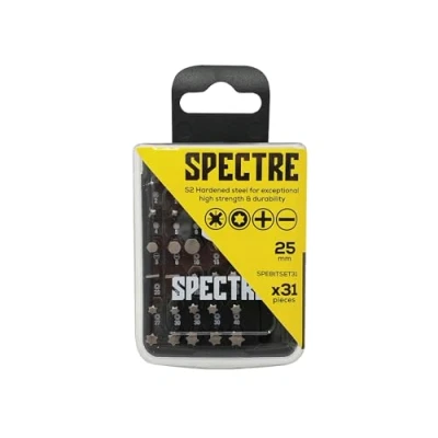 General description The ForgeFix 31 Piece Spectre Bit Set is an essential tool for any DIY enthusiast or professional. This set includes a variety of S2 heat-treated, hardened steel bits that are designed to withstand shock and wear. The precision machined tips help reduce cam out and prevent screw head damage, ensuring a reliable performance. Technical specifications Length: 25mm Number of Pieces: 31 Type: Mixed Bit Set MPN: SPEBITSET31 EAN: 5028485220329 Compatibility and accessories 4 x 25mm Slotted Bits: 3, 4, 5, 6mm 4 x 25mm Phillips Compatible Bits: PH1, PH2 (x2), PH3 5 x 25mm Pozidriv Compatible Bits: PZ1, PZ2 (x3), PZ3 13 x 25mm TORX Compatible Bits: TX10, TX15, TX20 (x3), TX25 (x3), TX27, TX30 (x3), TX40 4 x 25mm Hex Bits: 3, 4, 5, 6mm 1 x Bit Holder: 60mm Other information