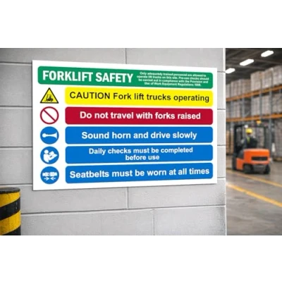 Forklift safety caution fork lift trucks operating do not travel with forks raised seatbelts to be worn at all times safety sign. 1mm flexible Plastic sign. Digitally printed for extra durability. Drill and screw in position or use double sided tape to mount onto suitable surface. All signs come with a 5-year warranty. All our signs are UV resistant meaning they will not fade in sunlight. Suitable for indoor & outdoor use.