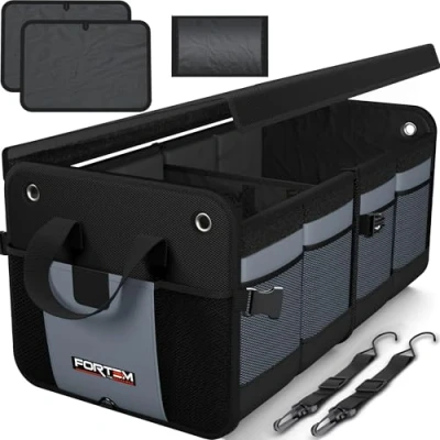 Sturdy Box Design – Fortem premium car boot storage is reinforced with rigid base plates to support the back and every side panel. Among car organisers and storage, ours will leave less mess to worry about with multiple side pockets and up to 3 compartments. The bottom half of the organizer is also waterproof. Stays in Place – Our car trunk storage organiser has non-slip strips to prevent sliding and adjustable straps to secure on to your trunk. Store small items in the tight mesh siding or pockets with lids. You can even connect 2 or more car boot bags with interlocking buckles. Multifunctional – Fortem Trunk organizers and storage make car stowing & tidying easy and simple. Organize a variety of products from groceries to office supplies, accessories (handbags, shoes,) or toys for kids. Consolidate the mess in your trunk and make room for your cooler or camp gear. Collapsible with Removable Lid– You can move your boot organiser to the backseat, front seat, or center of your vehicle since it is collapsible to 1 compartment. Keep folded in your trunk and use for groceries or even as containers for garage storage. The foldable, detachable lid keeps your goods out of sight for added security. Durability– No matter if it’s a large truck, SUV, or sedan, this boot storage is perfect for any size trunk. Fortem car storage trunk organisers are built to last!