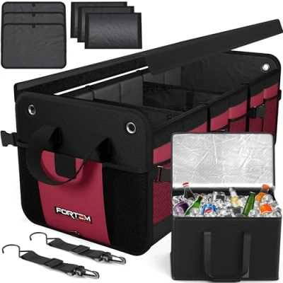 FORTEM Car Boot Organiser, Tidy, Storage, Collapsible Multi Compartment Non Slip Bottom, Adjustable Securing Straps, Soft Cover (3 Compartments w/Cooler, Red)