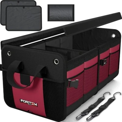 FORTEM Car Boot Tidy for Storage, Collapsible Multi Compartment Organiser, Non Slip Bottom, Adjustable Securing Straps, Foldable Cover (Standard Size, Red)