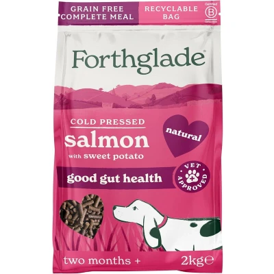Forthglade Natural Dry Cold Pressed Salmon Grain Free 2kg is a vet-approved, hypoallergenic dry dog food for all ages, featuring 29.5% salmon and 29.5% sweet potato, enriched with omega-3, glucosamine, and botanicals, and processed to lock in nutrients for sensitive digestion and joint support.