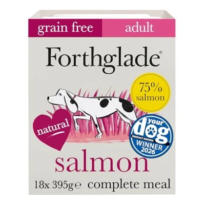 WET DOG FOOD: 18 x 395g trays of grain free dog food suitable for adult dogs aged 1-7 years, made with 75% salmon, potato & vegetables NATURAL DOG FOOD: Bursting with goodness and made using natural ingredients, with added vitamins, minerals & botanicals, gently steamed to retain as much natural flavour and goodness as possible FOOD FOR HAPPY DOGS: Complete & balanced hypoallergenic & grain free wet dog food recipe, which means it's kind & gentle on your dog's tummy and easy to digest plus free from junk & fillers VOTED BEST WET DOG FOOD 2026 YOUR DOG MAGAZINE: Award winning Forthglade dog food for the sixth year in a row, proudly made at Forthglade's factory in the heart of Devon B CORP: With our B Corp Certification, Forthglade is committed to a future of making positive pawprints on our planet, people and pooches
