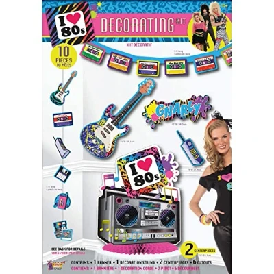 80s Party Decorating Kit 10 Pieces: 7ft Long Banner, 4ft Decoration String, 2 Centerpieces 15" Height and 6 Cutouts 7" - 15" The Perfect 80s Party Decoration Includes Long Banner, Decoration String, 2 Centerpieces and 6 Cutouts Ideal Dress Up for Themed Parties, Halloween and World Book Day, Manufacturer: Bristol Novelty