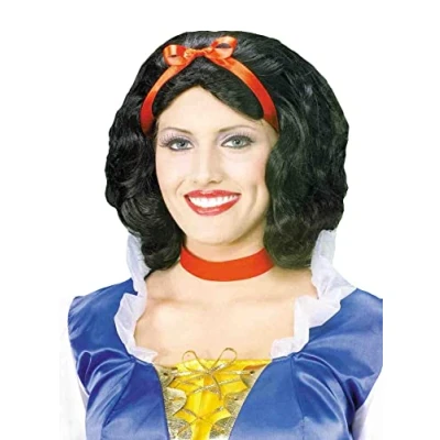 Black costume wig^Classic snow white hairstyle with red bow^For best results remove from package and style before wearing^One size, fits most teens and adults