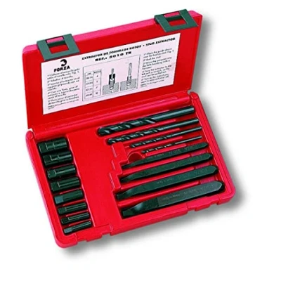 Set of 4 broken screw extractors. Includes 4 drill bits and 8 outer guides. In a red plastic suitcase., Manufacturer: Forza