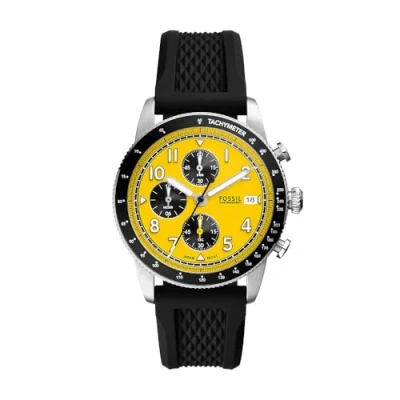 42mm case, 22mm band width, mineral crystal, Quartz movement with chronograph analogue display, imported. Round stainless steel case, with a yellow dial. Black, silicone band. Water resistant up to 50m: Wearable while swimming in shallow water.