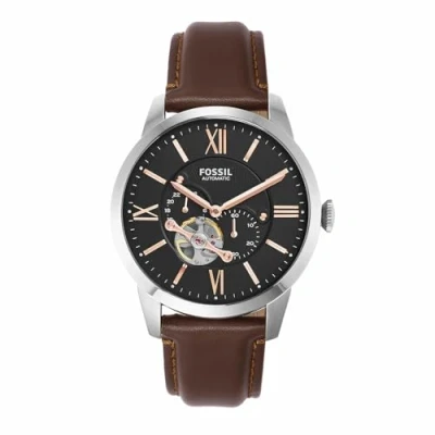 FOSSIL men watch - Round stainless steel case (diam. 44 mm) in polished and brushed finishing - 5 ATM water pressure resistance construction Dark brown genuine leather strap with dark brown stitching - Buckle Black two-layer dial with pattern, rose gold indexes and roman numbers at 3/6/9/12 and skeleton effect with silver and gold details from 6 to 8 - 2 hand automatic movement with 24h mode and small second's - Rose gold hands - Mineral glass Packed in Fossil collector illustrated tin box (various design)