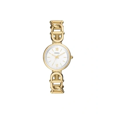 30mm case, less than 5mm band width, mineral crystal, Quartz movement with 3-hand analog display, imported. Round stainless steel case, with a gold dial. Gold, stainless steel bracelet. Water resistant up to 50m: Wearable while swimming in shallow water.