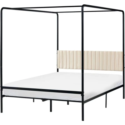 Canopy Bed with Upholstered Headboard. This four-poster bed offers a unique blend of industrial structure and refined comfort. The robust metal frame provides exceptional stability, while the upholstered headboard provides a comfortable backrest for reading. The canopy structure is ideal for hanging lighting or curtains, allowing for full customisation of ambience and style. It is a durable foundation that brings contemporary elegance to any master suite. Details: Product Type: Four Poster Bed General Color: Black, Beige Material Type: Metal Main Material: Steel Additional Material: Fabric Material Composition: 100% Polyester Fabric Upholstered Back: No Finish: Painted Dimensions: Headrest Dimensions: 146x39x4 Width: 146 cm Length: 207 cm Height: 170 cm Sleeping Surface: 140x200 cm Weight: 27 kg Weight Capacity: 360 kg Offer Includes: 1 x Bed Frame, Not Included: Mattress, Bedding and Cushions Key Features: A High Frame Enables Hanging of Curtains, Lights, and Decorations, Even