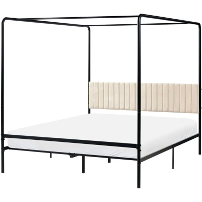 Canopy Bed with Upholstered Headboard. This four-poster bed offers a unique blend of industrial structure and refined comfort. The robust metal frame provides exceptional stability, while the upholstered headboard provides a comfortable backrest for reading. The canopy structure is ideal for hanging lighting or curtains, allowing for full customisation of ambience and style. It is a durable foundation that brings contemporary elegance to any master suite. Details: Product Type: Four Poster Bed General Color: Black, Beige Material Type: Metal Main Material: Steel Additional Material: Fabric Material Composition: 100% Polyester Fabric Upholstered Back: No Finish: Painted Dimensions: Headrest Dimensions: 166x39x4 Width: 166 cm Length: 207 cm Height: 170 cm Sleeping Surface: 160x200 cm Weight: 28 kg Weight Capacity: 360 kg Offer Includes: 1 x Bed Frame, Not Included: Mattress, Bedding and Cushions Key Features: A High Frame Enables Hanging of Curtains, Lights, and Decorations, Even