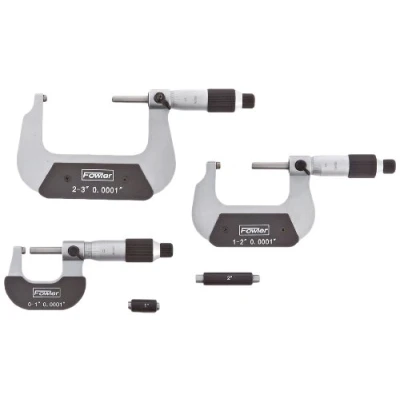 Outside micrometer with a 0 to 3" measuring range and flat anvil/spindle pair for general purpose measuring, set of three Vernier scale has 0.0001" graduation interval for precise readings Hardened and precision-ground anvil and spindle have 0.256" diameter micro-lapped carbide measuring faces with 0.00005" parallelism on 0 to 1" micrometers and 0.00003" flatness for accurate measurements Friction-style with ratchet stop applies constant force for repeatability between users and is suitable for one-handed operation Insulated frame helps reduce temperature-related expansion or contraction and isolates heat from the operator's hand