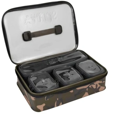 Fox Aquos Camo System - High quality bag system - Dimensions (lxwxh): 37 × 26 × 7cm - Supplied with four khaki accessory bags - Dimensions long internal bag (lxwxh): 33 × 10 × 6cm - Dimensions short internal bags (lxwxh): 13 × 9 × 6cm - Material: durable, waterproof EVA - 1 mm thick walls - 1.5 mm thick heavy duty base - Transparent gunsmoke lid - Extra large zippered sliders - Polyester carrying straps - Unique Fox Camo design - Perfect for storing small material The Fox Aquos Camo System consists of a spacious, high-quality and waterproof EVA bag containing four smaller accessory bags, in two different sizes. Perfect for storing small material, end tackle, PVA material, lead and so on. The bags have 1mm thick walls and a heavy duty base of 1.5mm for extra strength. In addition, the bags have high quality, large zippers and a transparent gunsmoke lid with logo. The extra large sliders simplify the use of the zippers and the durable polyester carrying straps ensure that your material is always easy to transport.