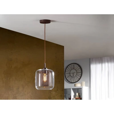 Pendant made of lacquered metal, chocolate colour. Double glass shade, inside of metal mesh and outside of glass.