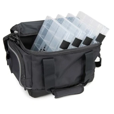 AmazonTop loading lure storage solution Main compartment loaded with 4 medium shallow boxes Additional rear and side pockets