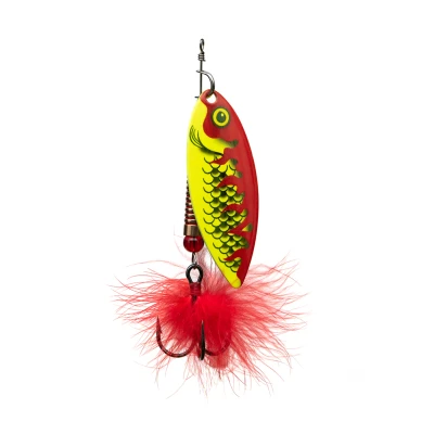 Fox Rage UV Spinner - Available in a variety of colors! - Great spinner - Weight: 26g - Blade size: 6 - VMC treble hook size 2/0 - UV colors - Silver finish on inside of blade - Special blade design for maximum action and brilliance - Brass body for weight - Red feathers for added attraction! The UV Spinner from Fox Rage is a great, eye-catching spinner. This spinner features a highly detailed pattern with UV colors. The silver finish on the inside of the blade and the special blade design combine for flashy action with maximum sparkle. The spinner is finished with a sharp VMC treble hook and red feathers for added attraction!