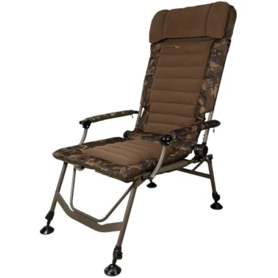 Fox Super Deluxe Recliner Highback Chair - Max load: 150kg - Seat height: 45-60cm - Seat width: 60cm - Backrest height: 80cm - The ultimate chair for (carp) anglers - Very comfortable - Fully adjustable - Double layer of foam in seat and back with micro-fleece - Padded headrest with adjustable height and angle - Camo neoprene armrests - Leg locking with thumb screw - Extra high adjustable legs - Side pocket in seat The Fox Super Deluxe Recliner Highback Chair is the ultimate chair for carp anglers! This incredibly comfortable chair features a double layer of foam and micro-fleece in the high seat and backrest, literally making you sink into your seat. The headrest is also padded and adjustable in both height and angle. Of course, the legs are adjustable so that you look like a king even on uneven surfaces. The Fox Super Deluxe Recliner Chair is the ideal chair for carp anglers who want unparalleled comfort.