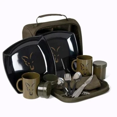 Fox Voyager 2 Persons Dinner Set - Complete dinner set for 2 persons - Dimensions: 28cm x 12cm x 28cm - Material outer shell: 100% polyester - Material padding: 100% polyethylene - Material lining: 100% polyester - 2x stainless steel knives, forks, spoons and teaspoons - 2x square black plates - 2x green Voyager mugs - 1x corkscrew - 1x large screw top tub - 2x small screw top tubs - 1x micro fleece towel - Padded polyester handles - Hard-wearing and water-resistant 300D treated polyester material - Double 10mm heavy duty zippers for complete reliability Complete dinner set for 2 in a shockproof, water-resistant bag. From coffee to main course, you have everything on hand. All materials used are of premium quality.