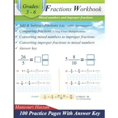 fractions Workbook : Add and Subtract (like unlike denominators) Converting Mixed numbers / Improper Comparing ... (100 practice pages with answer key) .