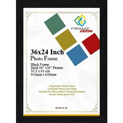 MATERIAL: These 36x24 Inch Black frames are made of Engineered wood MDF boards strong like wood does not have knots or kinks which disturbs the smooth surface, Perfect for your gallery wall decoration. MOULDING SIZE: Moulding Width 30mm, Moulding Depth 15mm and Moulding Rebate 8mm DISPLAY ORIENTATION: 24" x 36" Frames can be displayed both WALL MOUNTED Either Portrait or Landscape. READY FRAME: 36 x 24 inch frames comes with Perspex Sheet front, MDF backing, & hooks, So you dont have to buy anything separately. SAFE & SECURE : We supply frames with Perspex Sheet (Styrene). Styrene is a low-cost lightweight and shatter-resistant glazing material. Ideal where safety is a consideration, but does require careful handling IMPORTANT NOTE: The perspex sheet is protected by thin sheet. Remove the protective sheet from both sides of the Perspex before use. Picture display in the frame will not supply the item. PROTECTIVE PACKAGING AND FAST DISPATCH: We try to provide quality packing so you don’t have to worry about any damage. But if your parcel gets damaged during transit we will be happy to replace it as quick as possible.