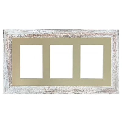 Metro Frame Distressed White with Light Grey Mount 21 x 10 for 3 Images Size 7 x 5 Inch Plastic Glass Frame is complete with plastic glass and MDF backing board and mount, ready to hang landscape or portrait. Size refers to the Image size not the overall frame size The frame moulding is made from mdf The frame moulding size is 40mm wide x 16mm deep manufactured in the UK.