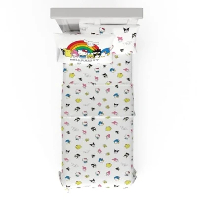 3 PIECE COTTON TWIN XL SIZE LINEN SET INCLUDES: 1 fitted sheet 39" (W) x 80" (L). 1 flat sheet 66" (W) x 96" (L). 1 standard pillow case 20" x 30". Designed to fit a standard twin XL size bed. Great for any college dorm room. EASY CARE: Crafted from breathable cotton, these sheets are machine washable and designed to get softer with every wash. For best results, wash in cold water and tumble dry on low. No ironing needed, making them perfect for everyday use. SUPER SOFT COTTON SHEETS: Made from 100% cotton, this sheet set offers natural softness and breathability for a comfortable night’s sleep. Lightweight yet durable, it’s a cozy staple—perfect for dorm rooms, guest beds, or everyday use at home HELLO KITTY DESIGN: Brighten up your space with the charm of Hello Kitty and friends. This colorful sheet set features a playful allover pattern showcasing beloved Sanrio characters like Hello Kitty, Badtz-Maru, My Melody, Pompompurin, and more. A cozy and nostalgic choice for dorms or home