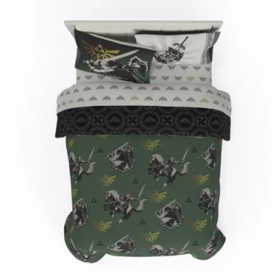 7 PIECE FULL SIZE COMPLETE LINEN SET INCLUDES: 1 fitted sheet 54" (W) x 75" (L). 1 flat sheet 81" (W) x 96" (L). 2 standard pillow cases 20" x30". 1 reversible comforter 72" (W) x 86" (L). Designed to fit a standard full size bed. SUPER SOFT EASY CARE BED IN A BAG: Crafted for comfort, the microfiber material is super soft and long lasting, keeping you warm and cozy all night or while camping. This high-quality bed set is an enduring choice that's sure to become a favorite. TWO DESIGNS IN ONE COMFORTER: Step into the world of Hyrule with this epic, reversible Legend of Zelda bed set! One side highlights the iconic Master Sword and Hylian Shield, while the reverse offers a dark and mysterious design inspired by the royal crests. Embark on your adventure with the perfect gear for rest! EASY CARE: You can throw the bedding set into the washer and dryer without worrying about the color fading or the need for ironing. The material is wrinkle-resistant making it a great choice for you bedroom. LEGEND OF ZELDA DESIGN: Fans of The Legend of Zelda can now journey into slumber with this heroic bedding collection. Available in twin and full sizes, the set includes a comforter, fitted and flat sheets, and pillowcases. Featuring the courageous Link, the Master Sword, and classic Zelda elements, this bed set is perfect for any fan looking to explore new realms of comfort.