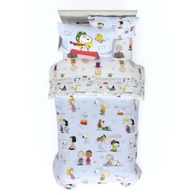 5 PIECE TWIN SIZE COMPLETE LINEN SET INCLUDES: 1 fitted sheet 39" (W) x 75" (L). 1 flat sheet 66" (W) x 96" (L). 1 standard pillow case 20" x 30". 1 pillow sham 26" x 20". 1 reversible comforter 64" (W) x 86" (L). Designed to fit a standard twin size bed. SUPER SOFT EASY CARE BED IN A BAG: Crafted for comfort, the microfiber material is super soft and long lasting, keeping you warm and cozy all night or while camping. This high-quality bed set is an enduring choice that's sure to become a favorite. TWO DESIGNS IN ONE COMFORTER: Bring the timeless charm of Peanuts to your sleep haven with our Peanuts Bed Set! The front showcases the beloved Peanuts gang against a soothing blue backdrop, while the reverse side unveils a delightful comic strip, ensuring bedtime is filled with laughter and nostalgia. Cozy up to the heartwarming world of Peanuts! EASY CARE: You can throw the bedding set into the washer and dryer without worrying about the color fading or the need for ironing. The material is wrinkle-resistant making it a great choice for you bedroom. PEANUTS DESIGN: Experience playful nostalgia with our Peanuts Comforter and Sheet Set! The comforter features the iconic Peanuts gang on a whimsical adventure against a vibrant backdrop. Paired with sheets adorned in charm, it's a fun blend of comfort and laughter for your cozy haven!
