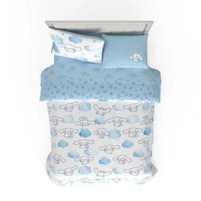 7 PIECE FULL SIZE COMPLETE LINEN SET INCLUDES: 1 fitted sheet 54" (W) x 75" (L) featuring deep pockets and fits 10-12" thick mattress. 1 flat sheet 81" (W) x 96" (L). 2 standard pillow cases 20" x30". 1 twin/full reversible comforter 72" (W) x 86" (L). Designed to fit a standard full size bed. SUPER SOFT EASY CARE BED IN A BAG: Crafted for comfort, the microfiber material is super soft and long lasting, keeping you warm and cozy all night or while camping. This high-quality bed set is an enduring choice that's sure to become a favorite. TWO DESIGNS IN ONE COMFORTER: The comforter showcases Cinnamoroll in playful cloud-filled scenes on one side, while the reverse features a delicate pattern of hearts on a soft blue background. This reversible design allows you to change up the look of your bed whenever you like, adding versatility and style to your bedroom decor. EASY CARE: You can throw the bedding set into the washer and dryer without worrying about the color fading or the need for ironing. The material is wrinkle-resistant making it a great choice for you bedroom. CINNAMOROLL DESIGN: CINNAMOROLL DESIGN: Drift into a world of sweet dreams with our Cinnamoroll Comforter and Sheet Set! The comforter features adorable Cinnamoroll floating on fluffy clouds, surrounded by soft blue tones that create a serene and whimsical atmosphere. Paired with coordinating sheets adorned with charming Cinnamoroll poses, this set is the perfect blend of cuteness and comfort, bringing a touch of magic to your cozy haven!