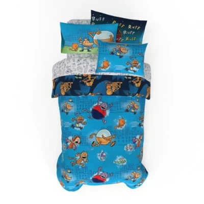 5 PIECE TWIN SIZE COMPLETE BED SET INCLUDES: 1 fitted sheet 39" (W) x 75" (L) fits up to a 10" inch thick mattress. 1 flat sheet 66" (W) x 96" (L). 1 standard pillow case 20" x 30". 1 pillow sham 26" x 20". 1 reversible comforter 64" (W) x 86" (L). Designed to fit a standard twin size bed. 7 PIECE FULL SIZE COMPLETE BED SET INCLUDES: 1 fitted sheet 54" (W) x 75" (L) fits up to a 10" inch thick mattress. 1 flat sheet 81" (W) x 96". (L) 2 standard pillow cases 20" x 30". 2 pillow shams 26" x 20". 1 reversible comforter 76" (W) x 86" (L). Designed to fit a standard full size bed. SUPER SOFT EASY CARE CHILDREN’S BED IN A BAG: Crafted for comfort, the microfiber material is super soft and long lasting, keeping kids warm and cozy all night. This high-quality bed set is an enduring choice that's sure to become a favorite. You can throw the bedsheets and comforter into the washer and dryer without worrying about the pattern fading. The material is wrinkle-resistant, making it a great choice for any child's bedroom. REVERSIBLE COMFORTER WITH ACTION-PACKED FUN: The reversible comforter features two bold designs celebrating Dog Man. One side shows Dog Man and friends on a navy backdrop, while the other bursts with comic-inspired scenes on blue. Perfect for bringing adventure to bedtime! DOG MAN COMIC ADVENTURE DESIGN: Transform your child’s room into a world of action and creativity with the Dog Man bedding set! Featuring bold illustrations of Dog Man, Petey, and friends, this set sparks imagination and brings comic book fun to every bedtime adventure.